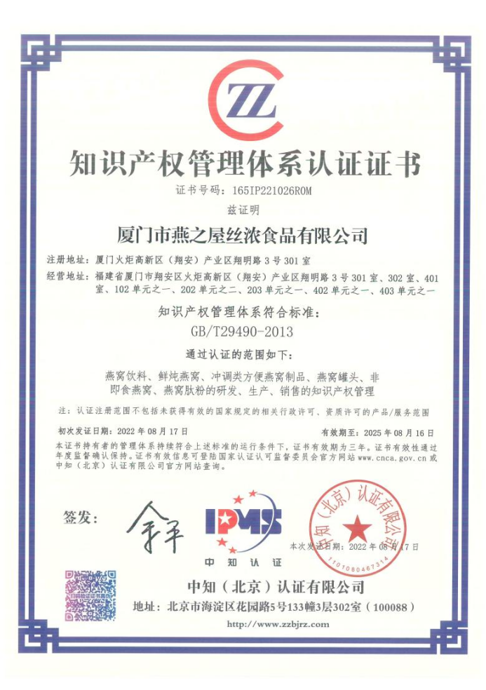此外,2022年6月,燕之屋成立“知識產(chǎn)權(quán)管理小組”,深入實施知識產(chǎn)權(quán)強企戰(zhàn)略。同年8月,燕之屋通過前期的知識產(chǎn)權(quán)管理現(xiàn)狀診斷、構(gòu)建知識產(chǎn)權(quán)管理體系,并通過內(nèi)部自查調(diào)整、經(jīng)過內(nèi)審會議以及管理評審不斷進行完善體系,最終由中知(北京)認(rèn)證有限公司對燕之屋主體進行外部現(xiàn)場審核認(rèn)證,順利通過國標(biāo)《企業(yè)知識產(chǎn)權(quán)管理規(guī)范》(GB/T29490-2013)的貫標(biāo)認(rèn)證,獲得知識產(chǎn)權(quán)管理體系認(rèn)證證書,標(biāo)志著燕之屋在知識產(chǎn)權(quán)規(guī)范化管理、知識產(chǎn)權(quán)運用、知識產(chǎn)權(quán)保護等方面達(dá)到國內(nèi)燕窩行業(yè)前沿水平。今年1月,國家知識產(chǎn)權(quán)局公布2023年度國家知識產(chǎn)權(quán)優(yōu)勢企業(yè)評定結(jié)果,燕之屋憑借行業(yè)內(nèi)先進的研發(fā)創(chuàng)新實力、完備的知識產(chǎn)權(quán)管理體系以及突出的知識產(chǎn)權(quán)管理水平,成功榮獲“國家知識產(chǎn)權(quán)優(yōu)勢企業(yè)”稱號,自主知識產(chǎn)權(quán)能力贏得權(quán)威認(rèn)可。