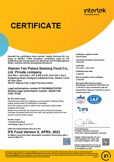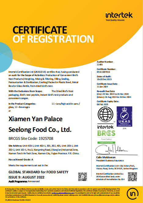 為了響應(yīng)美國官方的高標(biāo)準(zhǔn)要求,燕之屋分別通過了HACCP食品管理體系認(rèn)證、BRC全球食品安全標(biāo)準(zhǔn)認(rèn)證、IFS國際卓越標(biāo)準(zhǔn)認(rèn)證和食品出口備案資質(zhì),參加了美國FDA指定的由中國檢驗(yàn)檢疫科學(xué)院舉辦的BSPC培訓(xùn),并順利通過考核獲得出口資格,通過了FDA、FCE、SID注冊(cè)。此外,燕之屋更主動(dòng)將產(chǎn)品送至權(quán)威檢測(cè)機(jī)構(gòu)SGS,152項(xiàng)指標(biāo)檢測(cè)全部合格通過,印證燕之屋卓越產(chǎn)品力。2024年10月25日,燕之屋在廈門海關(guān)系統(tǒng)報(bào)檢通關(guān)。之后,燕之屋旗下高品質(zhì)燕窩產(chǎn)品冰糖官燕(60gx6、60gx12)、碗燕·禧孕款(80gx3)、碗燕·尊享款(158gx6)、碗燕·甄愛款(108gx6)、碗燕·濃鮮款(138gx10)通過美國食品藥品管理局(FDA)審批,順利運(yùn)抵紐約,正式上架開售,為當(dāng)?shù)叵M(fèi)者帶來來自中國的高端尊貴滋養(yǎng)。