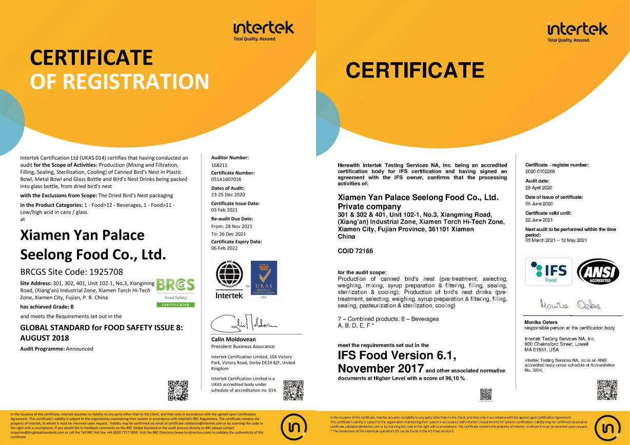 圖:燕之屋獲得BRC和IFS歐洲品質(zhì)雙認(rèn)證